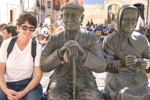 We are in the old part of town, which is normally a pleasant and interesting place to walk around, but this place is a bit… well, edgy. Lots of graffiti, lots of closed and boarded-up shops. Is this the right place? It doesn’t feel right. We carry on walking and come out of the old town into the town ‘proper’ and find it very pleasant. Lovely shops, all clean and tidy, very nice. We stop at a bar for a drink outside in a little patch of sun that we have found. Within 20 minutes, though the temperature has dropped and we are cold to the bone and hungry. We walk to the bus via the rather modern but old-style immense cathedral, and get back to Jess, who is warm and welcoming.