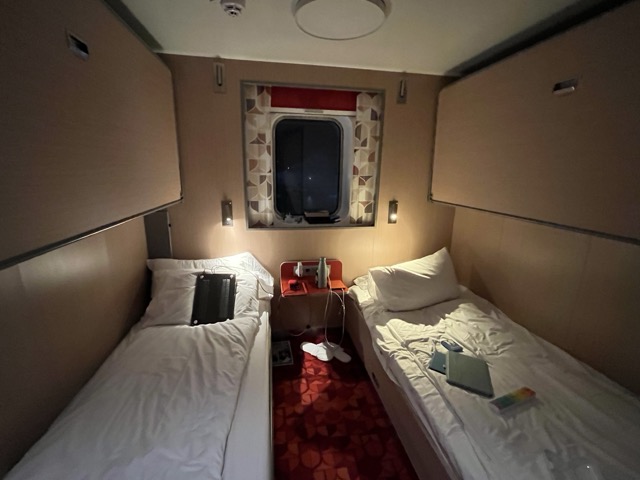 Once we get on board the Brittany Ferries boat, we settle into our cabin. We have brought some comforts from home, slippers, robes, and our own pillows, amongst other things, just to make our journey that little extra comfy.