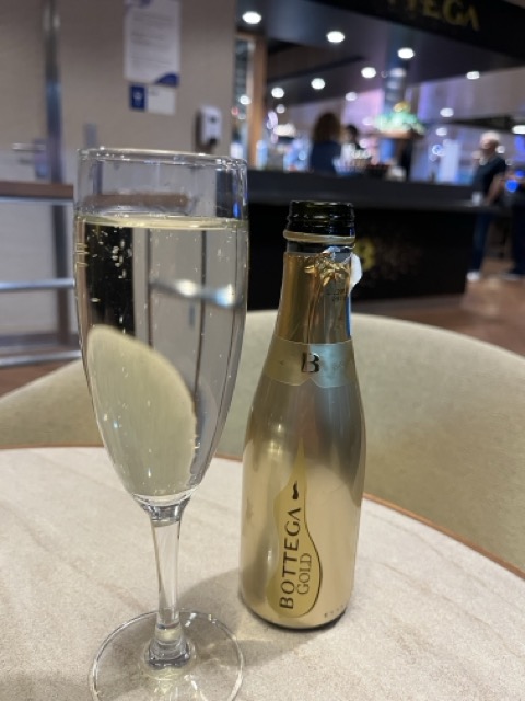We have booked into the main restaurant for dinner tonight, in the fancy bit of the boat, but first we have a glass of fizz for an aperitif. For dinner, we both choose from a set menu, salad bar and then a rare steak with a glass of Merlot. It’s all rather delicious and sophisticated; the salad bar is generous with huge prawns and smoked salmon. We expected the price to damage the bank card, but it’s all very reasonable. The food and service are excellent, the ship is French-flagged with French staff, so of course, the food is very good. It’s to be expected. They do know what to do with a saucepan!