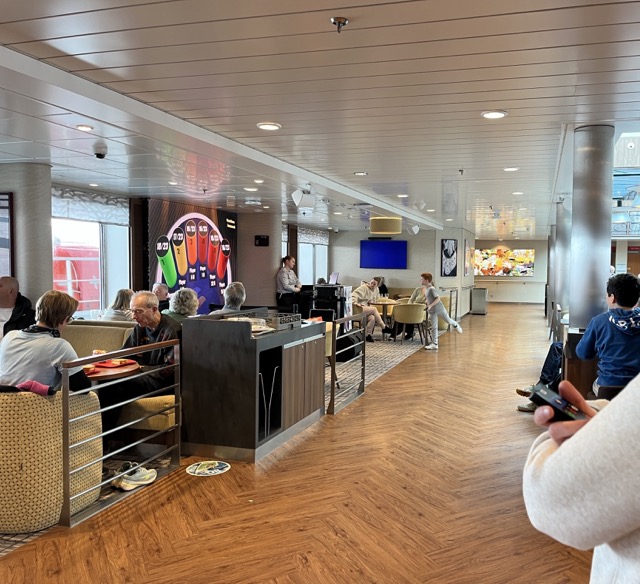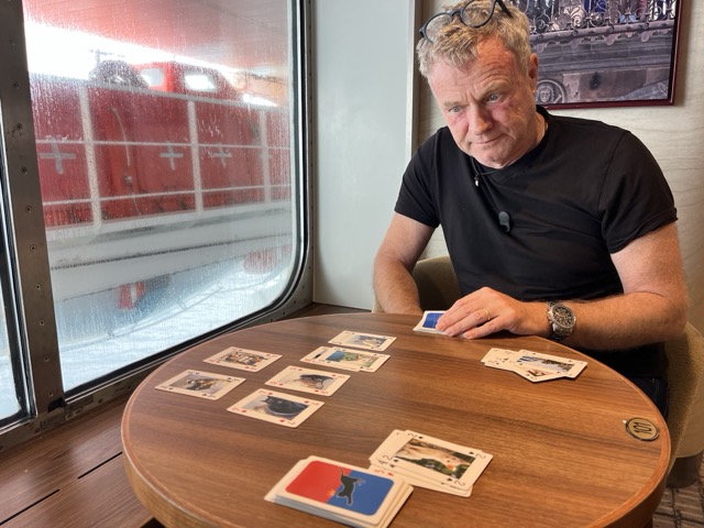 Del slept well last night, but H, unfortunately, not so well; it wasn’t the gentle rolling of the ship keeping her awake; she just couldn’t sleep. By 9am, the rolling swell is quite large and hitting us side on, twisting and rolling the ship. We have a light breakfast of coffee and croissants in the restaurant. There are some rather green-looking children here on board, clutching sick bags.