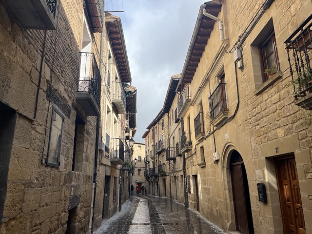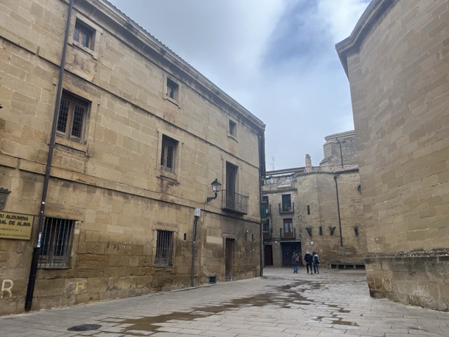 We have a light breakfast and set off. Today we are visiting the Rioja wine region. Our first stop is to a cute little town on a hill called Laguardia. The parking place has views over the vineyards, which stretch for miles. All the vines look dead and withered, and the weather is showery and cold; it’s hard to imagine that soon this will all turn into lush vines of grapes in the sun.