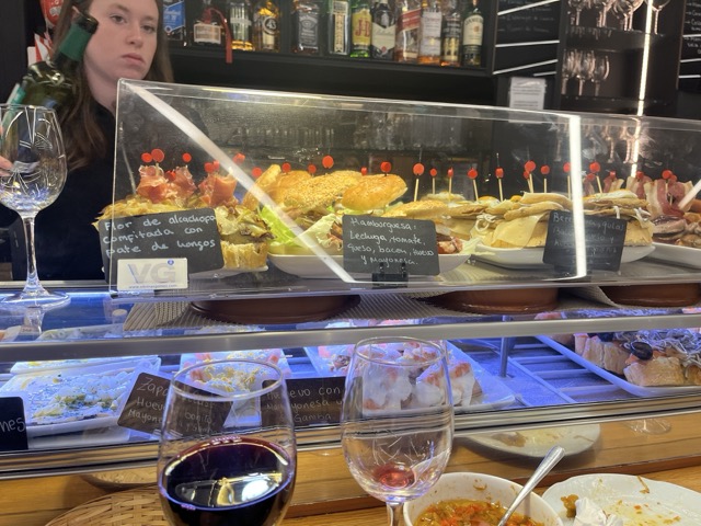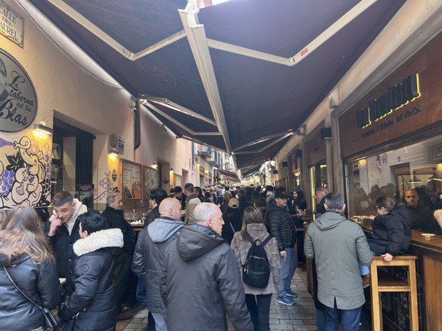 We take a walk up the famous tapas street, Calle del Laurel. It is just packed…