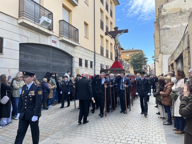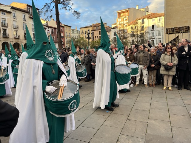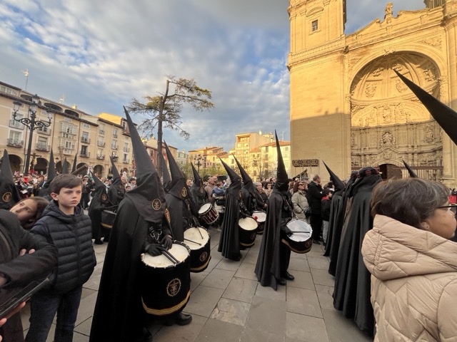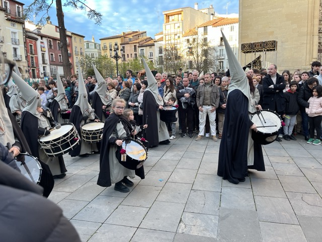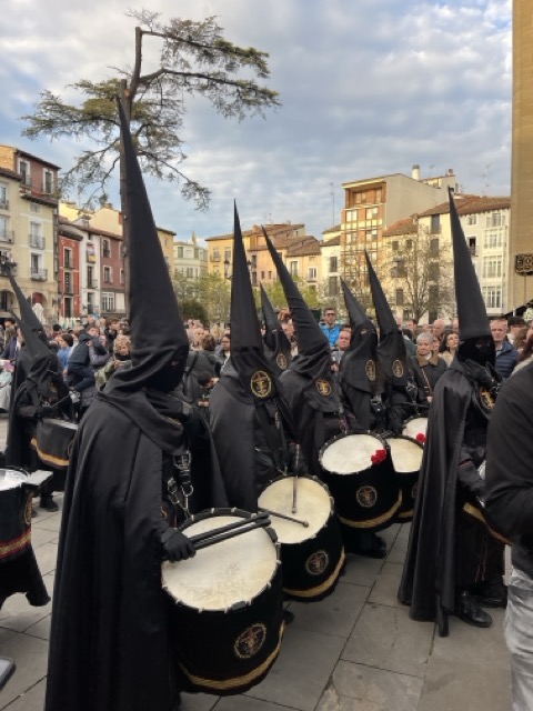 We try a couple of places, sampling a few of the local specialities. Riojan potato stew (nicer than it sounds), garlic mushrooms and squid, and a pastrami carpaccio. We wander around, taking in the atmosphere and notice quite a few preparations for Easter events tomorrow. Perhaps we should stay another day now that we have our space?