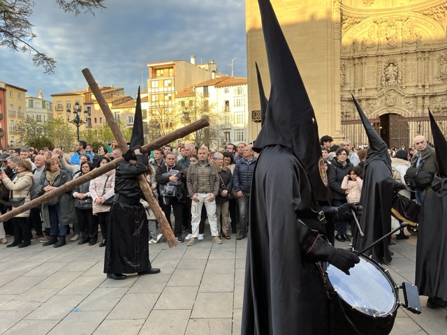 After a quiet afternoon, we walk this time back into town and see that it’s become very busy. In the square, there are a few floats set up ready to be carried on the shoulders of the penitents wearing hats and gowns. Their outfits are remarkably like the ones of the Ku Klux Klan, and it looks very strange to our eyes, but here it’s the dress and does not mean anything dodgy.