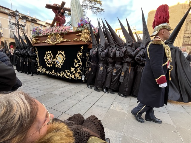 Each float has its own marching drum band, and soon it becomes very noisy. We watch for a good while, we have a good position near the front, and the crowd is now eight deep. Easter here is a bigger event than Christmas. These processions can go on for hours; in some parts of Spain, they have been known to go overnight!